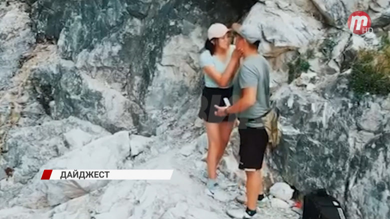 Живописное предложение руки и сердца в природном парке Шумак. На фоне прекрасного водопада. Возлюбленная девушка отвернулась, наслаждаясь волшебным пейзажем, в этот момент молодой человек решил сделать шаг.