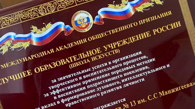 Детская школа искусств №13 им. С.С. Манжигеева стала лауреатом Всероссийской национальной премии «Лучшее образовательное учреждение России». Номинацию учредила Международная Академия общественного признания. Школу отметили за значительные успехи в организации творческого и воспитательного процесса, а также за эффективное применение педагогических методик в воспитании подросткового поколения.